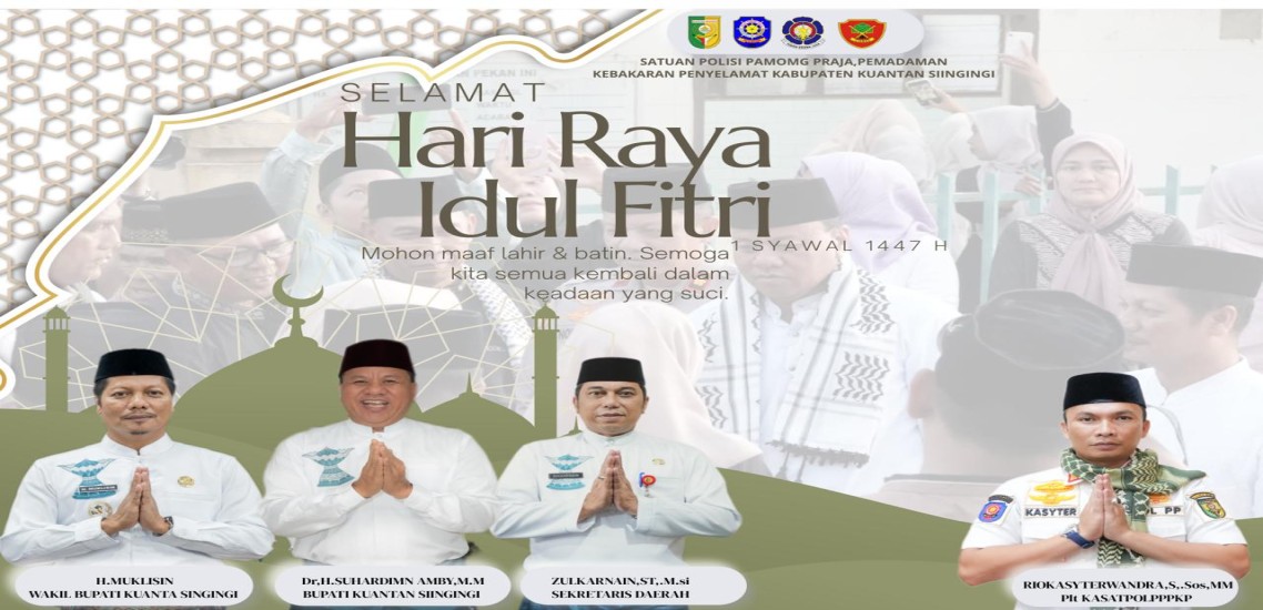 Kami, seluruh jajaran Satpol PP, Pemadam Kebakaran dan Penyelamatan Kabupaten Kuantan Singingi mengucapkan: "Selamat Hari Raya Idul Fitri 1447 H. Mohon maaf lahir dan batin."